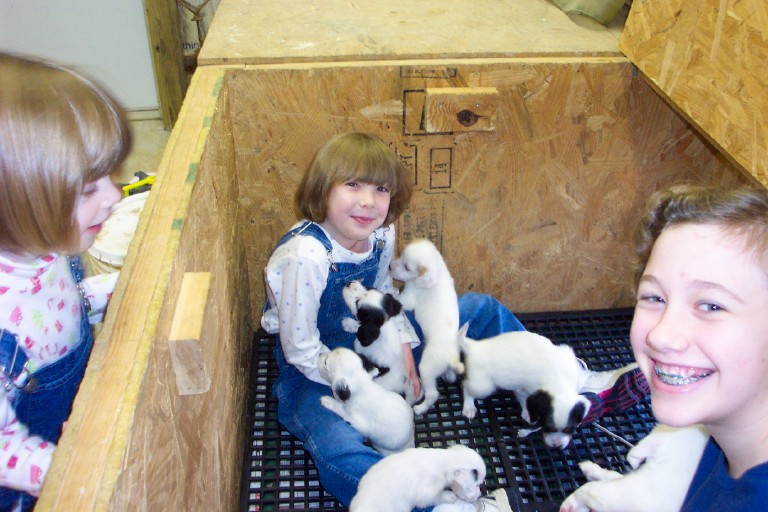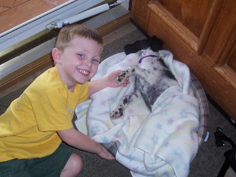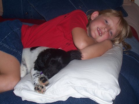 "Hi Randy & Kena, Well, we finally named her after much thought. 'Annie' is doing great!! The first thing the kids ask in the morning is 'Is Annie awake yet?' Needless to say, she is played out in the evening. Annie loves playing outside and listening to the birds and trying to follow the deer trails and then coming inside and crashing by the front door. She has such a wonderful personality. Here's a few recent pictures (We take them on a daily basis!!) - Dudley, Kim, Kendal & Harrison Alexander, Texas