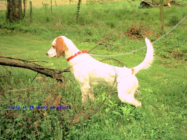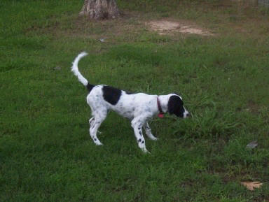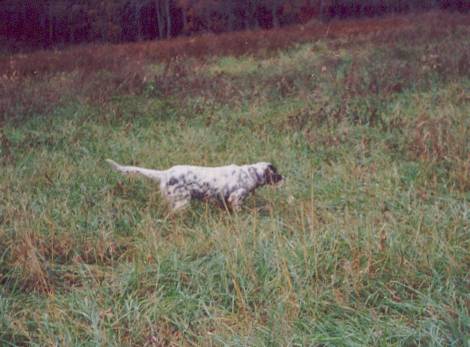 "'Cassie' did fine on the trip home. She slept most of the way. I had her outside and she is already acting birdy. Thanks for your help. We will keep in touch and will send pictures to let you see how she is growing. Also, please feel free to post our email addresses and name for references if you would like. . . Thanks again. If we hear of any one interested in getting a bird dog we will give them your web address." . . . "Sending you some pics . . . She is pointing and doing really good. She knows what she is supposed to do. We could not have picked a better dog than the one we got." - Pat & Rhonda, Indiana