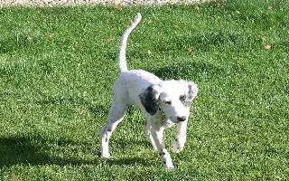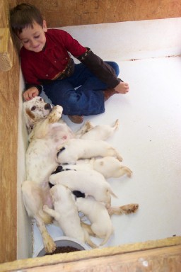 "Just want to let you know that the male pup that I bought from you is doing great. He seems to be very bold and you can tell that he has been socialized with human touch since birth. . . So far he is doing great, he has really bonded with me. He is very bold, he is hunting when I take walks with him in the evenings. he is already pointing a grouse wing on a string by sight and by scent. He has been doing so well that yesterday I planted a quail for him where he could not see it, and when he came within 30 yards or so of the bird, his head went up and then his tail up and he immediately locked up into a beautiful point, very stylish looking, he held it for a long time before he broke point to go after the bird. This dog seems very birdy and so far I am very pleased with his temperament and his high head and tail carriage. Yesterday, while we were playing out in the front yard, I noticed him wind scenting something, so I tried to see what it was, and about 75 yards or so there was a rabbit in my horse pasture that he was scenting, wow I hope this is a small picture of things to come. . . Thanks for selling me this dog and for answering all my questions. . . P.S. I forgot to mention that this pup loves to fetch my old leather gloves over and over again, he can't seem to get enough." - Mike, Kentucky