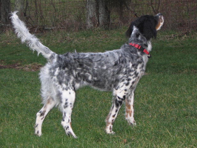 at 4 mos., "Hunter" (Llewellin) at 6 mos. pointing a wing while retrieving a