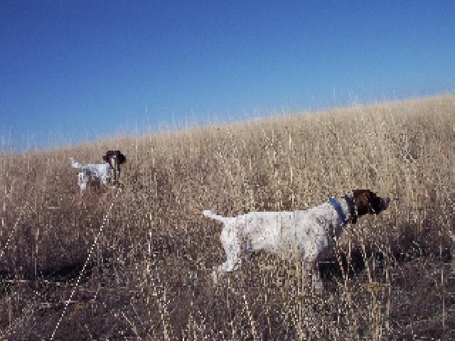 "They are learning their house manners well and are a real thrill to have in the woods with us. Both dogs are progressing very well and we are extremely pleased with each of them. Hunter is developing into a very handsome dog. Tanner is going to be a real gem. He is smart and responds well to commands. The pictures show both of the dogs on point." - Dick, Wisconsin